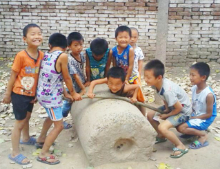 一根細樹棍和一塊石柱,農村孩子們就玩起了翹翹板