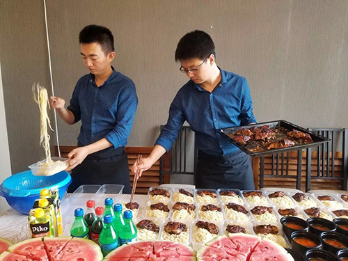 趁著兩位大廚張羅著分發盒飯的功夫,小編趕緊跟大廚交流起來。這兩位大廚分別是劉會彬和高德發,都是名副其實的“90后”,別看年輕,兩位大廚的廚藝精湛,參與保障過青島國際啤酒節、國際象棋大賽等國際節慶活動及賽事。